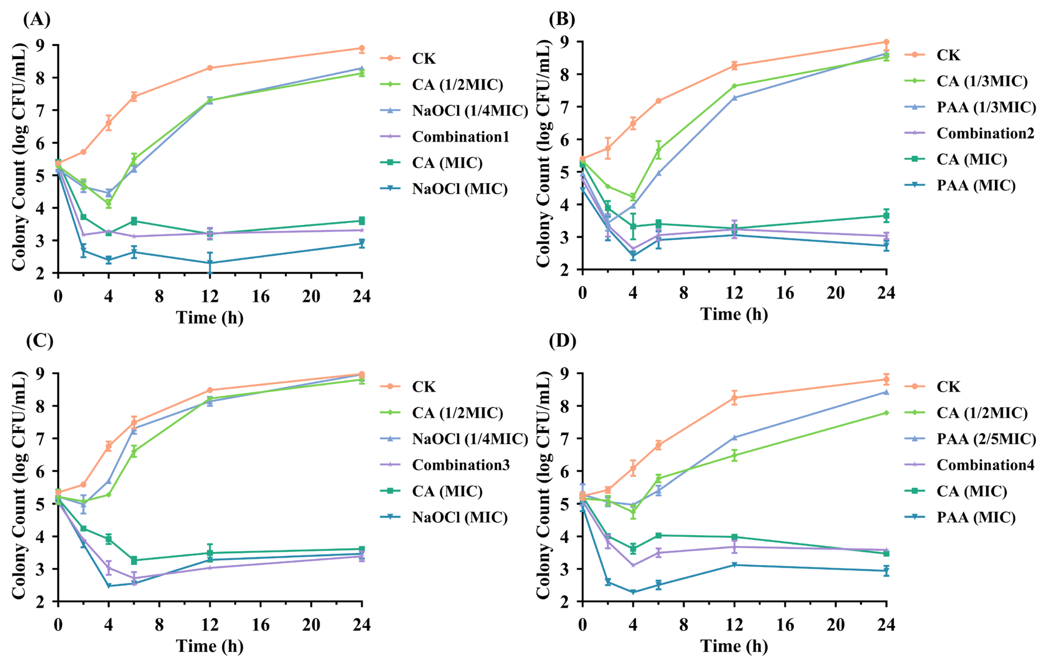 Figure 1A). In contrast, CA (1/2 MIC) and NaOCl (1/4 MIC) alone exhibited little to no antibacterial activity, maintaining bacterial counts at 8.13 ± 0.03 log CFU/mL and 8.29 ± 0.06 log CFU/mL, respectively. Moreover, results from Combination 3 indicate that the antibacterial activity of the CA-NaOCl combination against