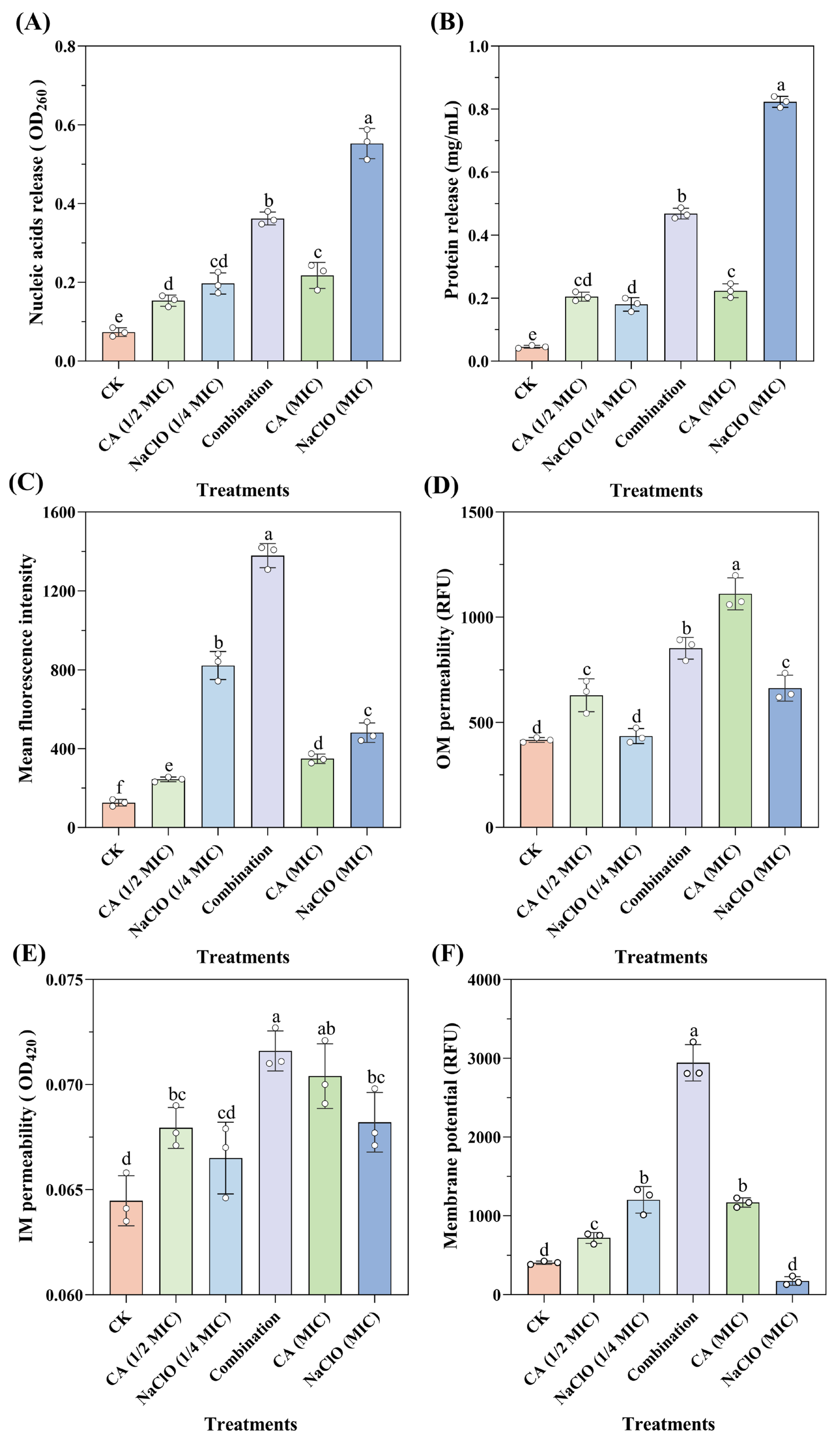 Figure 3E, while the differences between CA (MIC) and the CA-NaOCl combination were not statistically significant, significant differences were evident between NaOCl (MIC) or CA (1/2 MIC) or NaOCl (1/4 MIC) and the CA-NaOCl combination. The CA-NaOCl combination exhibited the highest absorbance value of 0.072, indicating increased IM permeability, while the control group had the lowest value of 0.064.