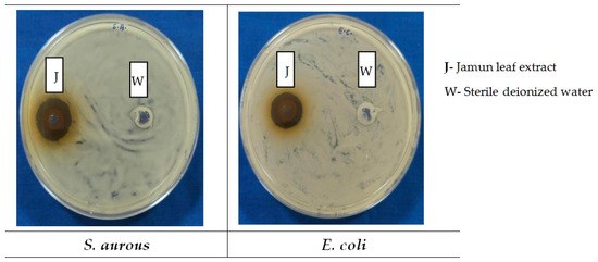 In the preliminary trials, jamun leaf extract was prepared following the method of Biswas et al. [31] with little modification (Figure S1), and its antimicrobial activity was evaluated against the test organisms using the well diffusion assay. The agar well diffusion test was found to be a suitable method for evaluating the antimicrobial activity of plant extracts. The zone of inhibition produced by the well diffusion test against the test microorganisms defines the antimicrobial efficacy [32]. For the well diffusion test, sterile nutrient plates (Mueller Hinton Agar—MHA) were made, and after they set for 5 min, holes were created in the plates using a well borer to make 6 mm wells. An inoculum suspension of S. aureus (ATCC 29213) and E. coli (ATCC 43888) was fixed to a 0.5 McFarland standard (108 CFU/mL) and then uniformly swabbed over the surface of the solidified agar. Finally, 100 μL of jamun leaf extract and 100 μL of SDW (negative control) were loaded separately into the wells, and the plates were incubated at 37 °C for 24 h [33,34]. The antibacterial efficacy of the leaf extract was assessed by measuring the diameter of the zone of inhibition in millimeters and recorded. Elfadil et al. [17] have demonstrated that the jamun leaf extract has a potent antimicrobial efficacy against both S. aureus and E. coli.