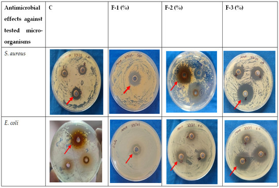 In the present study, two pathogenic microorganisms, viz., E. coli and S. aureus, were chosen to check the antimicrobial efficacy of both the plant extracts and the developed DW. These two microbes are closely associated with chicken meat and are commonly used as indicator organisms to assess the effectiveness of hygiene practices during their processing [28,29]. S. aureus has been recognized as the major cause of foodborne illness. Further, E. coli has been found to be the most frequent facultative anaerobic microbe; its presence in foods suggests fecal contamination [30].