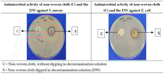 The results showed no zone of inhibition against the tested microbes for ‘C,’ whereas ‘S’ showed a well-defined zone of inhibition. Masuku et al. [73] demonstrated that the cleaning efficiency of non-woven wipes on food-contact surfaces can be significantly enhanced when they are impregnated with the disinfectant solution. Here in our study, the developed DS showed excellent microbial-decontamination effects, and when it was soaked in the non-woven cloth wipe, it effectively increased the efficiency of the DW synergistically.