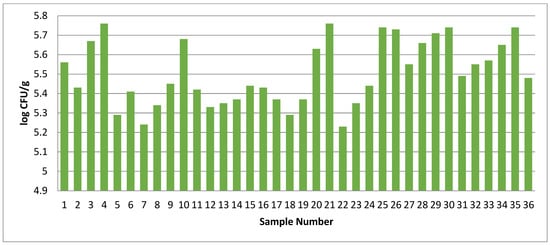 Nutrient-rich chicken meat is highly prone to microbial contamination, and this process starts from the point of slaughter itself. The cleanliness and hygiene in retail are very crucial for the final quality of the meat [4]. In the present study, the total plate count of chicken samples was undertaken for all 36 chicken meat samples collected from the market. All the chicken meat samples were found to be highly contaminated, and the counts varied from 5.23 to 5.76 log10 CFU/g (Figure 4) but were under the acceptable limit as prescribed by FSSAI. Our finding also aligns with the findings of Huang et al. [74]; they reported TPCs between 3 and 6 log10 CFU/g for raw poultry meat samples.