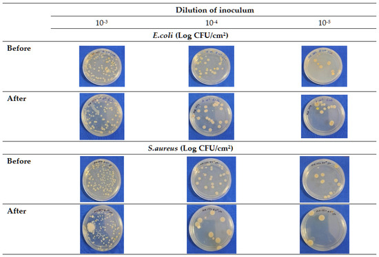 The outcome of the spiking test shows (Figure 5 and Table 5) that there was a significant reduction (p < 0.05) in both the E. coli (1.03 at 10−5 dilution, with p-00000, CI-95%, 0.90, 1.16) and S. aureus (1.14 at 10−5 dilution, with p-00000, CI-95%, 1.01, 1.25) counts across all the dilutions (10−3, 10−4, and 10−5). Reductions in microbial loads were >1 log10 CFU/cm2 in all dilutions, except at the 10−4 dilution for S. aureus.