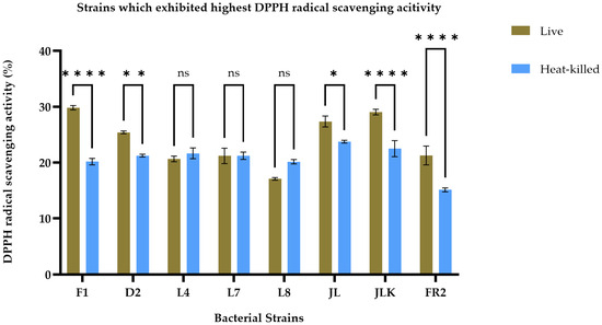 DPPH radical scavenging activity of live (brown bars) and heat-killed (blue bars) bacterial strains. Statistical analysis by two-way ANOVA followed by Šídák’s multiple comparisons test revealed strain-dependent differences. Strains F1, D2, JL, JKL and FR2 exhibited significantly higher scavenging activity in live cells compared to their heat-killed counterparts (p < 0.01 to p < 0.0001). No significant differences were observed for strains L4, L7, and L8 (p > 0.05). Data are presented as mean ± SEM (n = 3). ns = not significant; * p ≤ 0.05, ** p ≤ 0.01, **** p ≤ 0.0001.