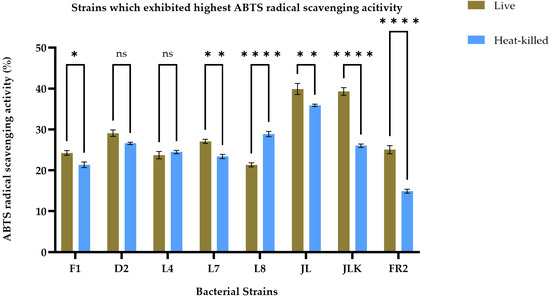 ABTS radical scavenging activity of live (olive brown bars) and heat-killed (blue bars) bacterial strains. Statistical analysis by two-way ANOVA followed by Šídák’s multiple comparisons test revealed treatment-specific differences across strains. L8 showed a modest but significant increase in heat-killed cells compared with live forms. No significant differences were observed for D2 and L4. Strains F1, L7, JL, JLK, and FR2 exhibited significantly higher activity in live cells than in their heat-killed counterparts (p < 0.01 to p < 0.0001). Data are presented as mean ± SEM (n = 3). ns = not significant; * p ≤ 0.05, ** p ≤ 0.01, **** p ≤ 0.0001.
