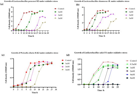 Growth of Lacticaseibacillus paracasei D2 (a), Lacticaseibacillus rhamnosus JL (b), and Weissella cibaria JLK (c) under oxidative stress. The strains were cultured in MRS broth supplemented with H2O2 at concentrations of 1, 2, and 3 mM. In contrast, Latilactobacillus sakei F1 (d) was grown under a broader range of H2O2 concentrations (0.5, 1, 2, 4, and 8 mM).