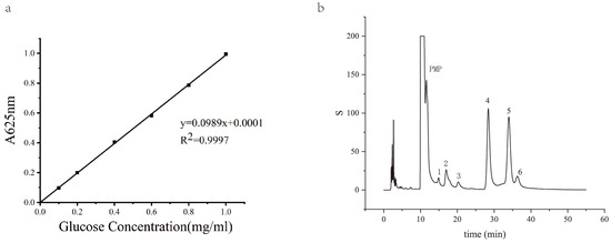 HPLC chromatograms of monosaccharides from standard samples and polysaccharide samples. (a) A glucose standard curve for polysaccharide concentration quantification in P. cyrtonema. (b) HPLC chromatograms of monosaccharides from PCPs.