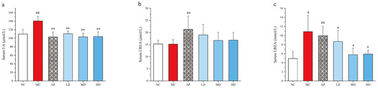 Effects of PCPs on the levels of (a) serum UA, (b) serum CREA, (c) serum urea in hyperuricemic mice. Values are expressed as the mean ± SD (n = 8). # p < 0.05; ## p < 0.01 vs. the NC group; * p < 0.05; ** p < 0.01 vs. the model group; n.s., no significance. Normal control group (NC), model control group (MC), allopurinol (AP), PCPs–low-dose group (LD), PCPs–medium-dose group (MD), and PCPs–high-dose group (HD).