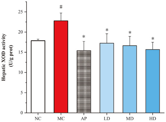 Effects of PCPs on hepatic XOD activity in hyperuricemic mice. Data are presented as the mean ± SD, (n = 8). # p < 0.05 vs. the NC group; * p < 0.05 vs. the model group. Normal control group (NC), model control group (MC), allopurinol (AP), PCPs–low-dose group (LD), PCPs–medium-dose group (MD), and PCPs–high-dose group (HD).