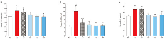 Effects of PCPs on the levels of (a) serum TNF-α, (b) serum IL-1β, and (c) serum IL-6 in PO/HX-induced HUA mice. Values are expressed as the mean ± SD (n = 8). # p < 0.05; ## p < 0.01 vs. the NC group; * p < 0.05; ** p < 0.01 vs. the model group; n.s, no significance. Normal control group (NC), model control group (MC), allopurinol (AP), PCPs–low-dose group (LD), PCPs–medium-dose group (MD), and PCPs–high-dose group (HD).