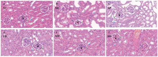 The renal units perform essential functions, such as glomerular filtration and the selective reabsorption and secretion processes in the tubules. The results of the pathological section examinations of the kidneys of mice in each group are shown (Figure 5). In the figure, the black arrow indicates the glomerulus, the green arrow points to the renal capsule, the blue arrow highlights the proximal convoluted tubule, and the red arrow marks the distal convoluted tubule. The kidneys of mice in the normal group (Figure 5a) had a normal tissue morphology and structure, normal glomerular structure, and normal tubular epithelial cell structure [43,44]. The gaps between renal tubules were obvious, and the lumen was obvious.
