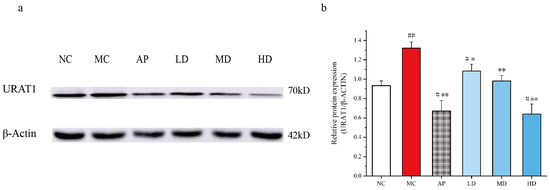 The kidneys were washed with cold PBS two to three times and subsequently homogenized in nine equivalent volumes of ice-cold RIPA lysis buffer, with the protease inhibitor added shortly before use. After being left on ice for 30 min, the homogenate was centrifuged at 12,000 rpm for 10 min at 4 °C to obtain total proteins, and the concentration was determined using the BCA method. The samples were then subjected to SDS-polyacrylamide gel electrophoresis and transferred onto NC membranes. The membranes were blocked with TBST containing 5% skim milk for 2 h and incubated with the following primary antibodies at 4 °C overnight: anti-URAT1 (1:3000) and anti-β-Actin (1:20,000). This was followed by incubation with a secondary HRP-conjugated goat anti-rabbit IgG (Immunoglobulin G, 1:10,000) antibody at room temperature for 2 h. Finally, the membranes were treated with ECL and photographed using a chemiluminescence imager. The protein bands were analyzed using ImageJ 1.54p software and normalized to the expression of β-Actin.