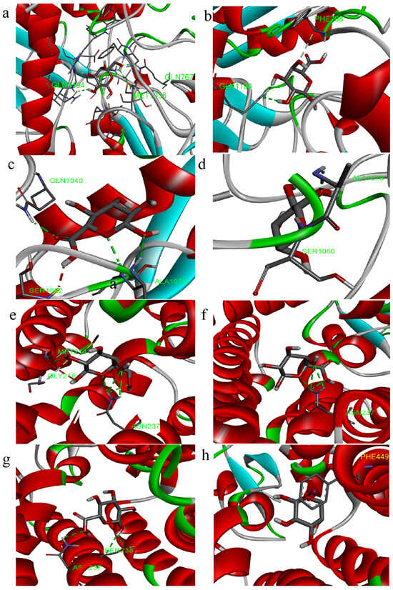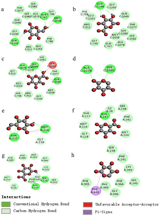 Two-dimensional images of molecular docking ((a–d): XOD, (e–h): URAT1; residues: galactose, galacturonic acid, glucuronic acid, and arabinose).