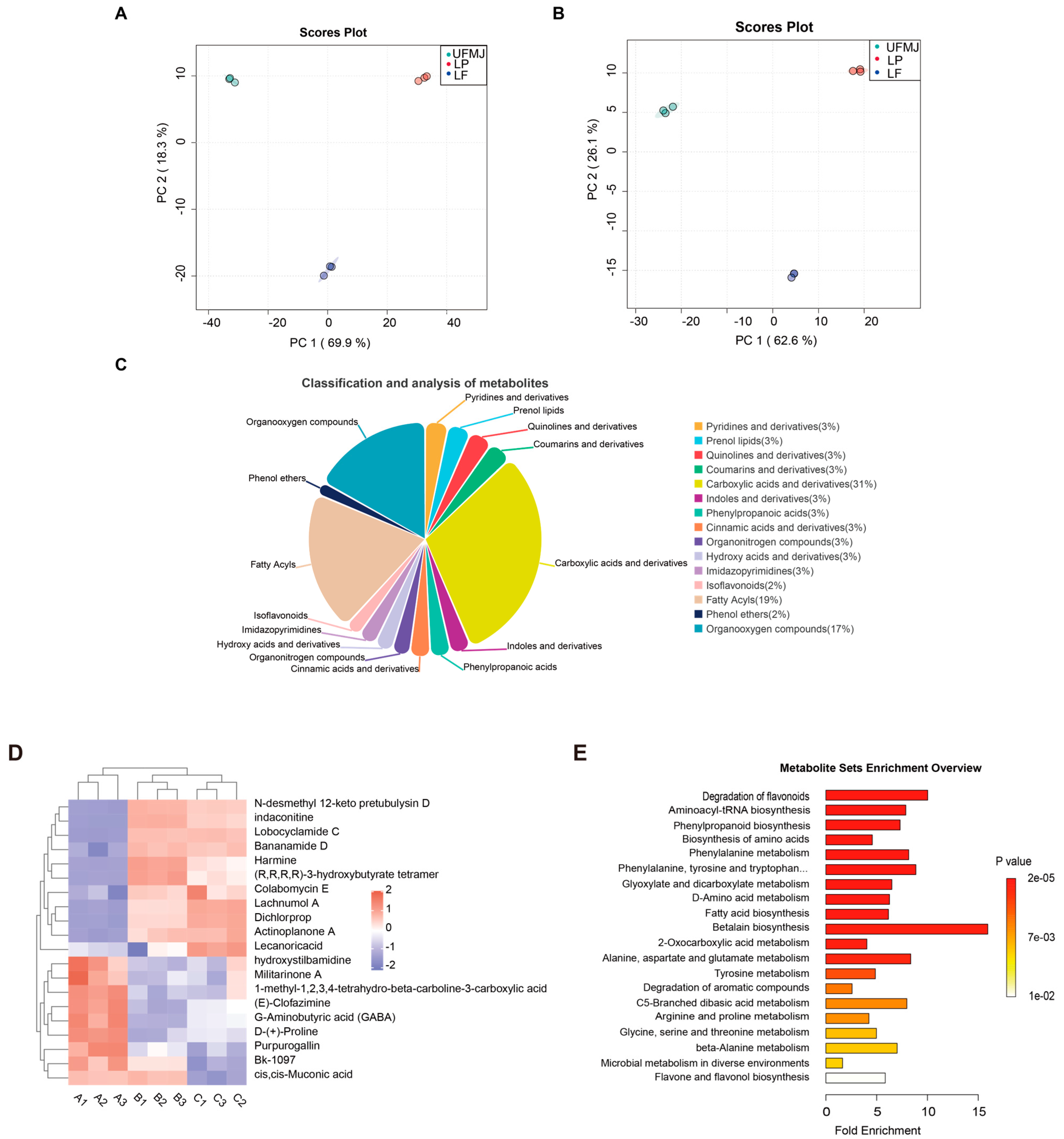 Chicago/Turabian StyleLiu, Yufei, Quanjun Liu, Jinglong Wang, Xianqing Huang, Yanrui Wang, Mingwu Qiao, Yan Ma, and Dan Hai. 2025. "Metabolic Remodeling and Flavor Enhancement of Mulberry Juice Through Lactic Acid Bacteria Fermentation: A GC-IMS and Untargeted Metabolomics Approach" Foods 14, no. 19: 3398. https://doi.org/10.3390/foods14193398