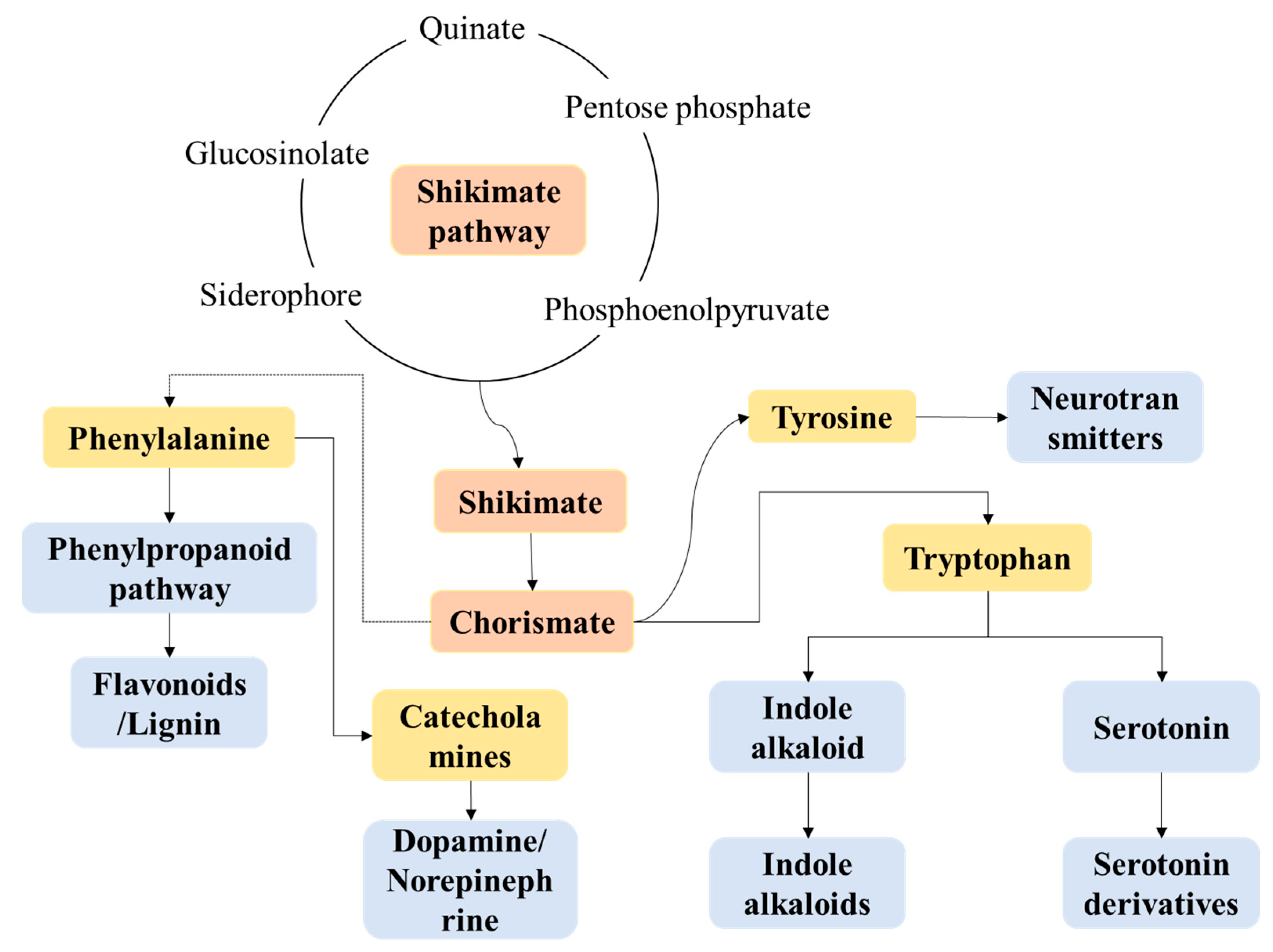 - Lee, J.-y.; Lee, J.-h. Recent Research Progress in the Microbial Production of Aromatic Compounds Derived from L-Tryptophan. J. Life Sci. 2020, 30, 919–929. [Google Scholar] [CrossRef]