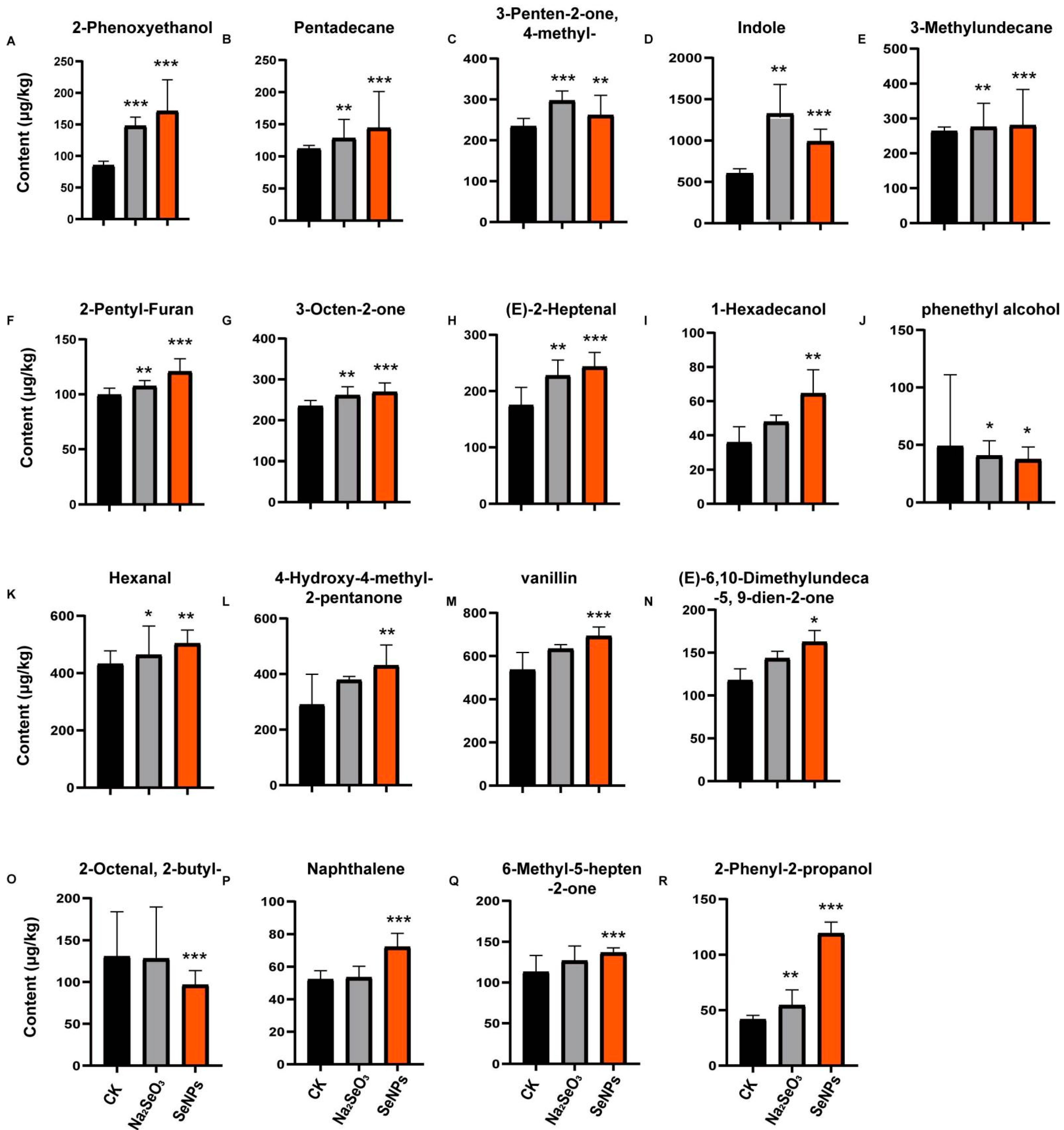 2.2. Influence of SeNPs and Na2SeO3 on VOCs in Three Rice Varieties