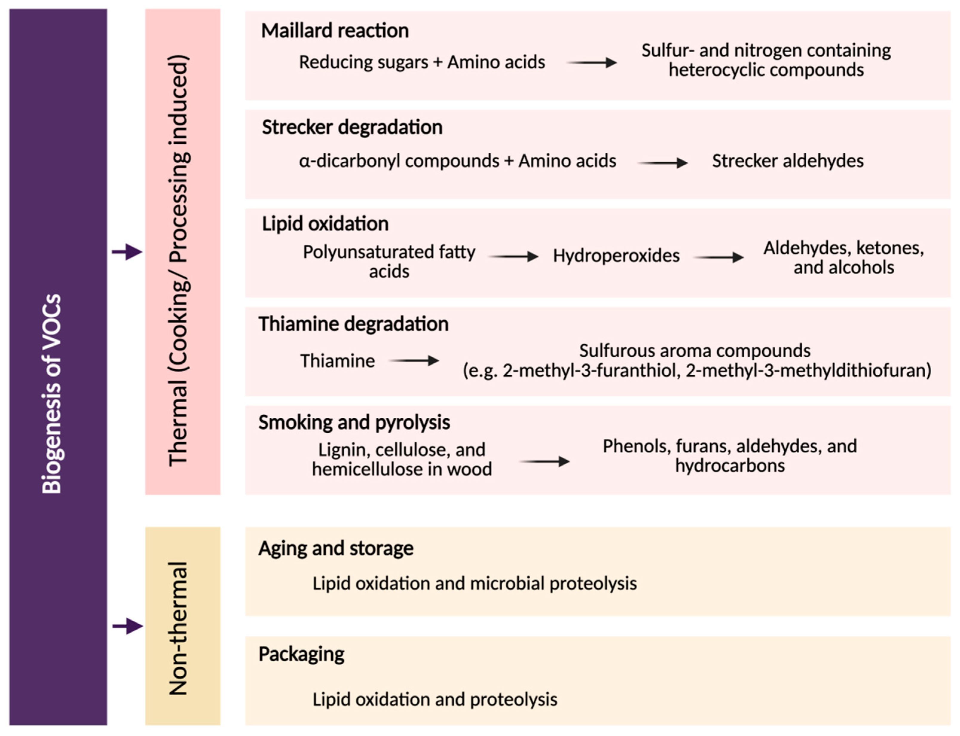 Cooking methods (roasting, boiling, sous-vide) | Roasting produced the highest aldehydes (hexanal, 13-fold increase). Sous-vide had lower oxidation but generated sulfur-containing VOCs. Boiling increased furans. | [72] |