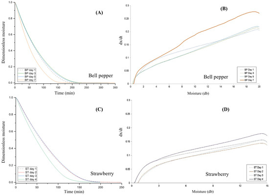 Drying curves (A) and drying rate curves (B) of bell pepper at 1 (fresh), 3, 5, and 7 days of accelerated decay (25 °C, 80% RH); and drying curves (C) and drying rate curves (D) of strawberries at 1 (fresh), 2, 3, and 4 days of accelerated decay (25 °C, 80% RH). The unit of dx/dt is (d.b.) min−1.