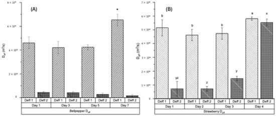 Effective moisture diffusivity (Deff) of bell pepper (A) measured at 1 day (fresh) and after 3, 5, and 7 days of accelerated decay (25 °C, 80% RH), and of strawberries (B) measured at 1 day (fresh) and after 2, 3, and 4 days of accelerated decay (25 °C, 80% RH). Deff 1 and Deff 2 denote moisture diffusivity for TGA drying in the first falling rate period and second falling rate period, respectively. * Treatment in (A) is significantly different (p < 0.05). a, b, x, y, z Treatments in (B) labeled with different letters are significantly different (p < 0.05).