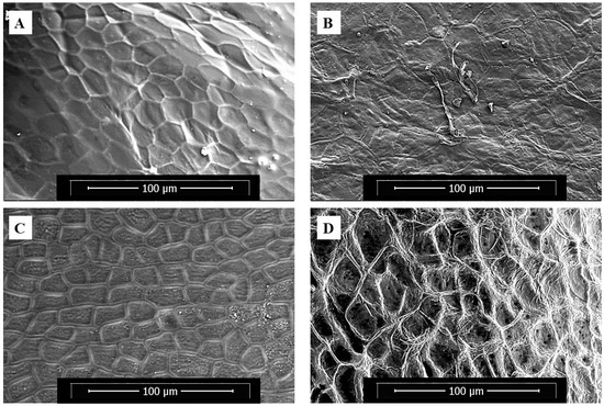 The ESEM micrographs of the fresh samples (Figure 3A,C) and the samples undergoing tissue degradation (Figure 3B,D) are shown in Figure 3. Fresh plant cells (Figure 3A,C) exhibit well-preserved morphology with intact, turgid cell walls and closely packed cellular structures. The defined cell boundaries and minimal surface irregularities reflect healthy tissue integrity typical of unspoiled fruit and vegetable samples. In contrast, bell pepper cells after 7 days of decay at 25 °C and 80% RH (Figure 3B) exhibited pronounced morphological degradation. The once well-defined cellular architecture appears collapsed, with extensive cell wall disintegration. These structural changes suggest significant loss of turgor and cellular cohesion, characteristic of advanced decay under high-moisture conditions [28,36]. The ST samples, after 4 days of decay at 25 °C and 80% RH, displayed a different pattern of degradation, characterized by collapsed cell walls and disrupted cellular integrity (Figure 3D). These significant alterations in cell structure align with the observed accelerated drying and elevated Deff in the decayed samples.