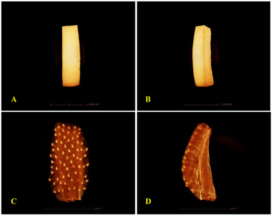 µ-CT scan microimages of external (A) and internal (B) tissue structure of fresh bell pepper, and external (C) and internal (D) tissue structure of fresh strawberries.
