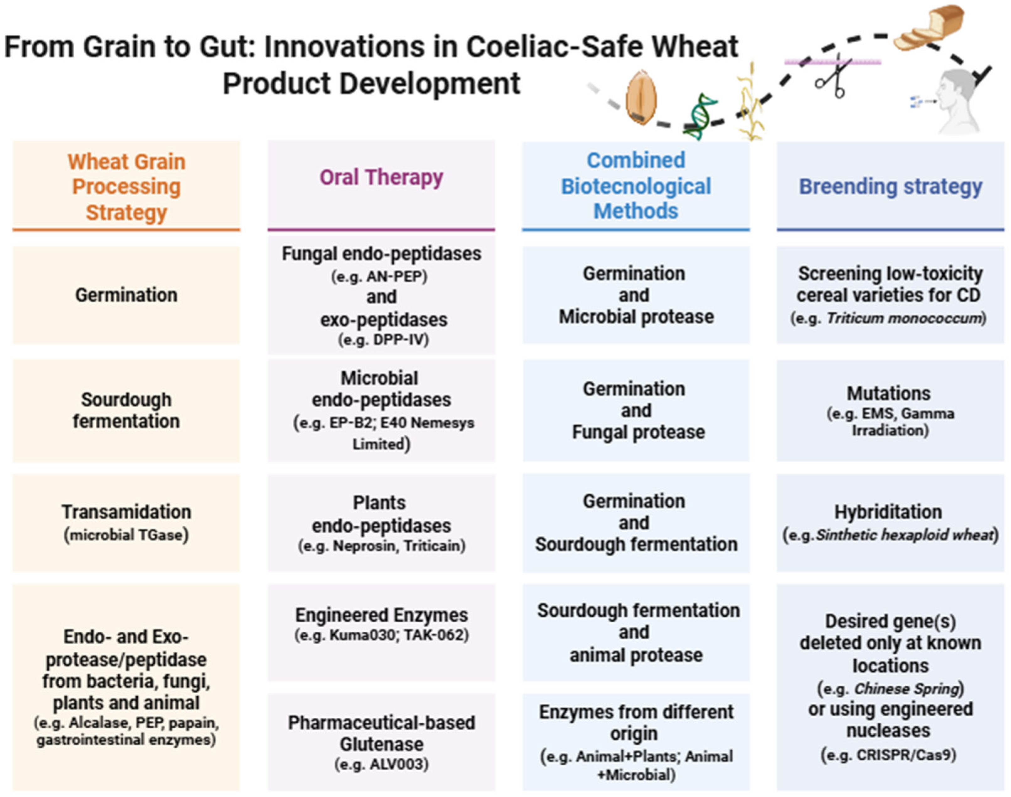 | Plant breeding | Less immunogenic alternative crops | Triticum monoccoum | Ancient wheat varieties that lack the D genome, known to encode highly immunogenic peptides. | Includes significantly fewer toxic sequences. | [120,140,141,142] |