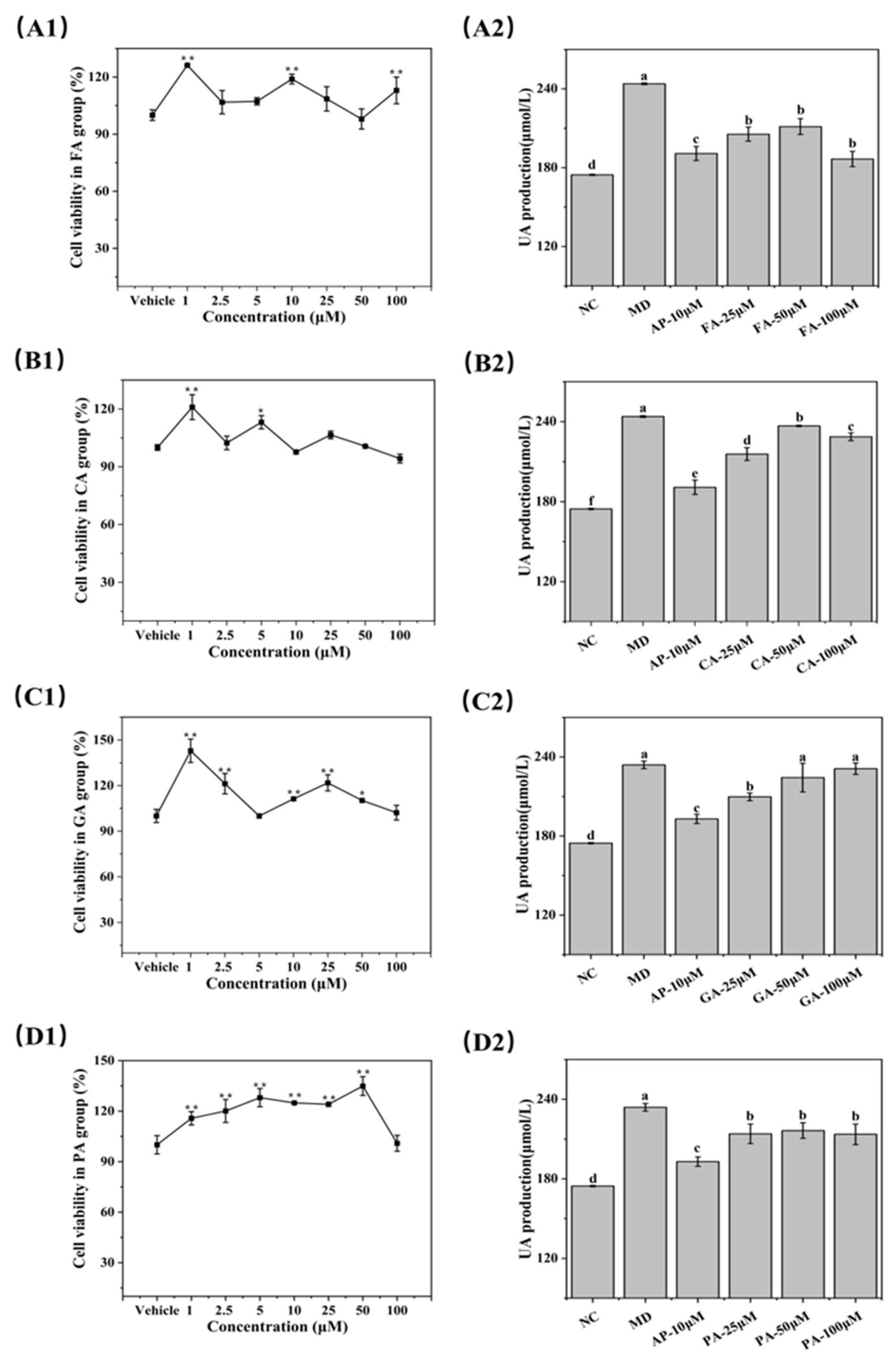 3.7. UA-Lowering Activity of Phenolic Acids in BRL-3A Cells
