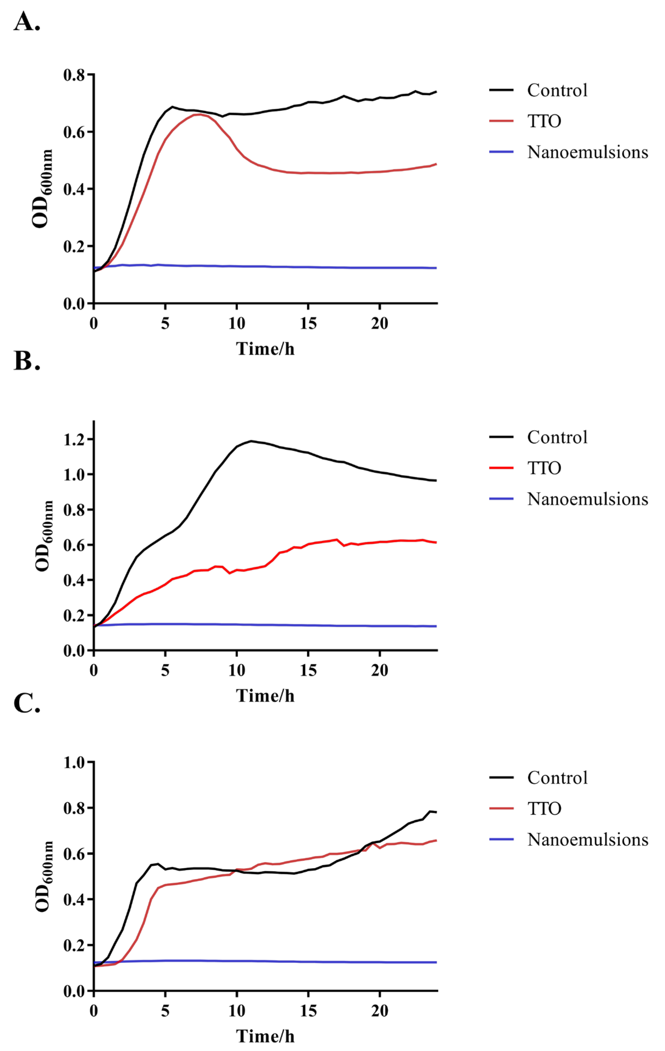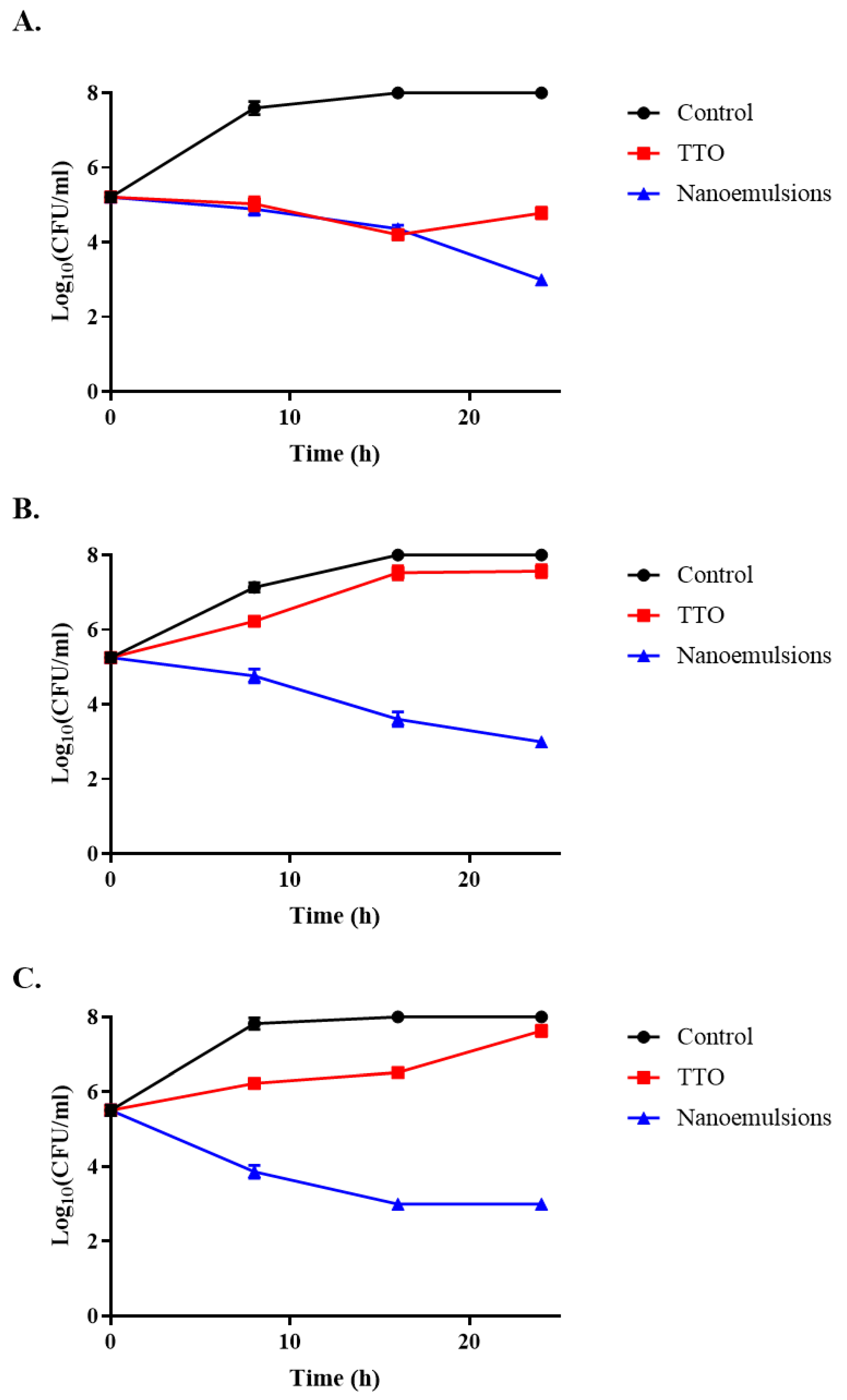 3.4. Antimicrobial Activity of the TTO Nanoemulsions