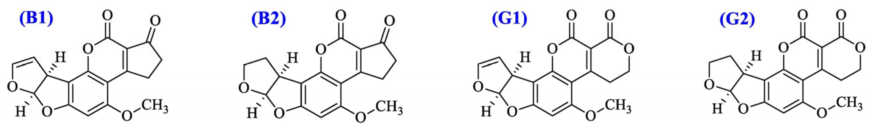 - Zhou, W.; Hu, L.B.; Zhao, Y.; Wang, M.Y.; Zhang, H.; Mo, H.Z. Inhibition of Fungal Aflatoxin B1 Biosynthesis by Diverse Botanically-Derived Polyphenols. Trop. J. Pharm. Res. 2015, 14, 605–609. [Google Scholar] [CrossRef]