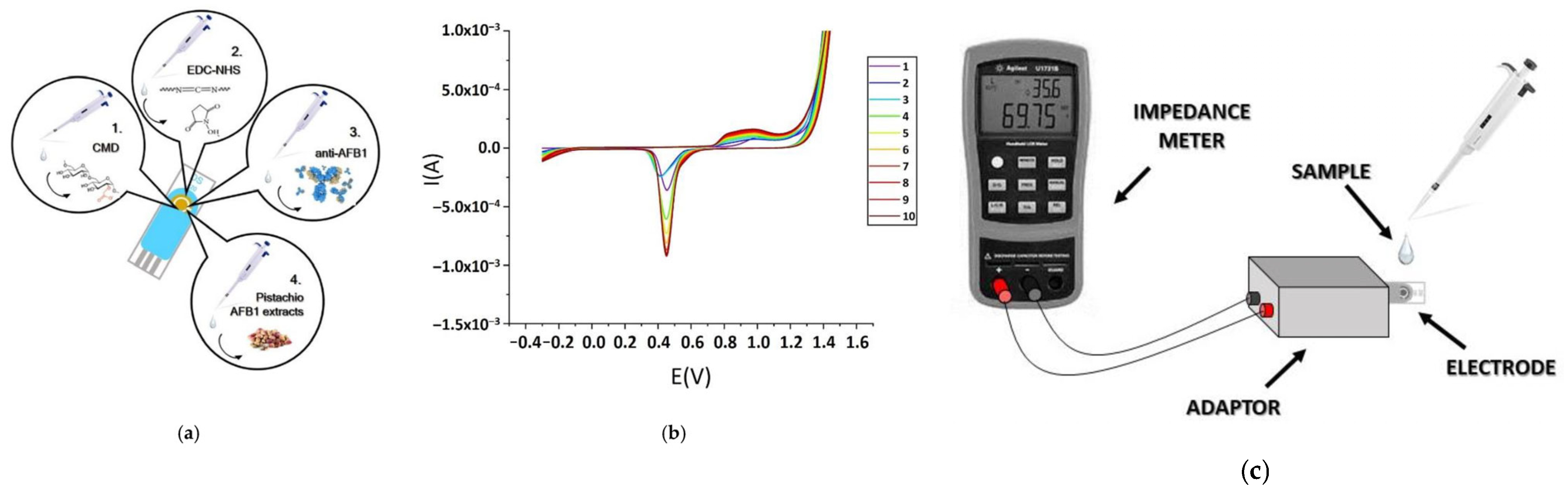 - Palakollu, V.N.; Vattikuti, S.V.; Shim, J.; Mameda, N. Recent Progress, Challenges, and Future Perspectives of Electrochemical Biosensing of Aflatoxins. Microchim. Acta 2025, 192, 1–24. [Google Scholar]