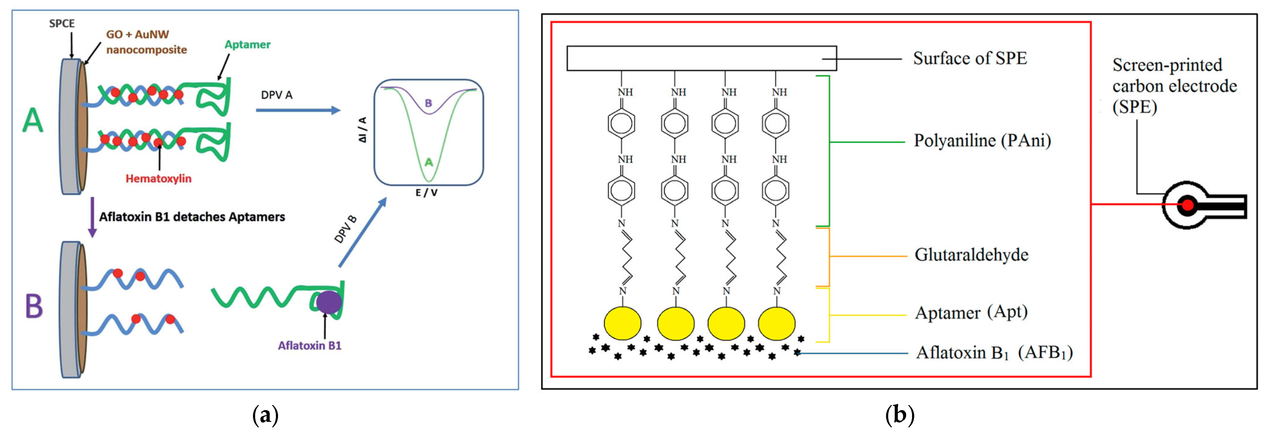 - Mousavi Nodoushan, S.; Nasirizadeh, N.; Kachuei, R.; Fooladi, A.A.I. Electrochemical Detection of Aflatoxin B1: An Aptasensor Prepared Using Graphene Oxide and Gold Nanowires. Anal. Methods 2019, 11, 6033–6042. [Google Scholar] [CrossRef]