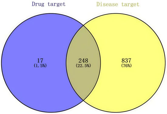To systematically identify ageing-related molecular targets, we investigated three established disease-gene databases: GeneCards (https://www.genecards.org/, version 5.12), Comparative Toxicogenomics Database (http://ctdbase.org/, updated 2023), and Online Mendelian Inheritance in Man (https://omim.org/). Using “aging” as the primary search term, we retrieved all associated targets (n = 27,783), followed by removal of duplicate entries (n = 1085 remaining). The protein targets of the D. officinale bioactive compounds (n = 248) were cross-referenced with ageing-related targets through Venn analysis using Venny 2.1 (https://bioinfogp.cnb.csic.es/tools/venny/ (accessed on 7 May 2025)), which yielded 248 putative anti-ageing targets (Figure 2). All gene symbols were standardised using UniProtKB (https://www.uniprot.org/, version release 2024_01) to ensure consistency in nomenclature.
