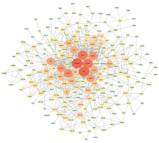 The 248 common targets were analysed using STRING version 11.0 to construct a PPI network (Figure 3), which comprised 216 nodes and 750 edges with an average degree value of 6.94, where nodes represent target proteins and edges represent interactions between proteins. In this network interaction, the larger the degree, the stronger the interaction between the targets. This also indicates that the particular key target protein plays a pivotal role in regulating the network as a hub target. Then, the Cytoscape 3.7.2 software was used for the visualisation and calculation of topological parameters, such as degree, BC, and CC. Moreover, the top 10 targets were obtained using the degree value as the condition for screening core targets, mainly involving HSP90AA1, SRCE, GFR, MAPK3, EP300, GAPDH, ESR1, APP, RELA, and PPARG. The core targets are listed in Table S3.