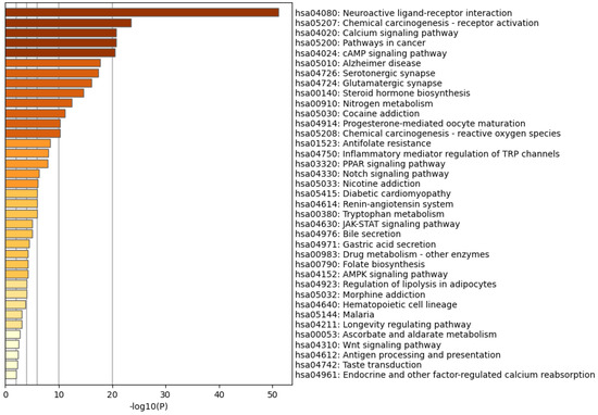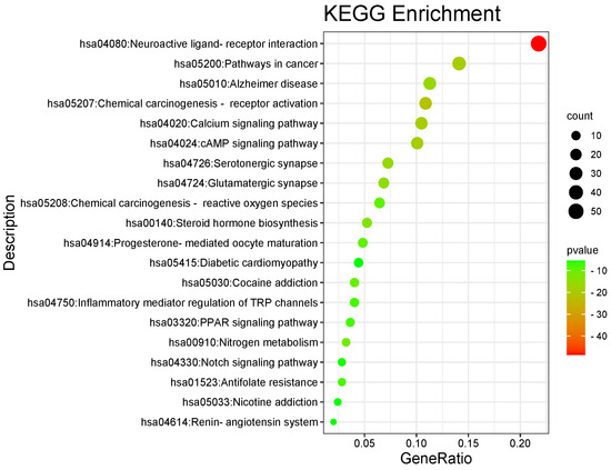 The Metascape database was used to perform GO enrichment analyses for biological BP, CC, and MF, as well as KEGG pathway analysis of a set of 248 common target genes. In the BP category, the most significantly enriched genes were associated with steroid hormone-mediated signalling pathways, intracellular receptor signalling pathways, and cellular responses to dopamine and catecholamine stimulation. Within the CC group, the most enriched genes were localised in glutamatergic synapses, interneuronal synapses, postsynaptic density, and other pre- and postsynaptic regions. The genes most prominently enriched in the MF category were also related to steroid hormone-mediated signalling pathways, intracellular receptor signalling pathways, and cellular responses to dopamine and catecholamine stimulation (Figure 4). KEGG pathway analysis revealed that the pathways involved in neuroactive ligand–receptor interactions, cancer, senile dementia, chemical carcinogenesis-receptor activation, calcium signalling, cAMP signalling, and the renin–angiotensin system are implicated in the regulation of these common target genes (Figure 5).
