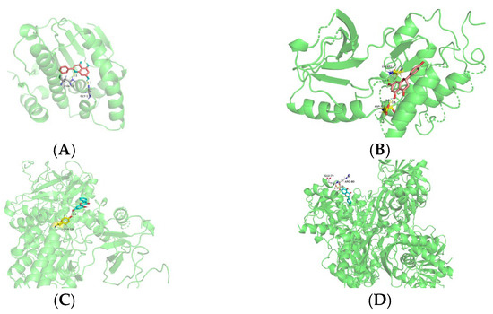 Schematic (3D) representation of the molecular model of the active component combined with target proteins. Component: 5,7-dihydroxyflavone. Target proteins: (A) HSP90AA1, (B) EGFR, (C) MAPK3, and (D) GAPDH. Components: norartocarpanone and naringenin. Target protein: HSP90AA1.