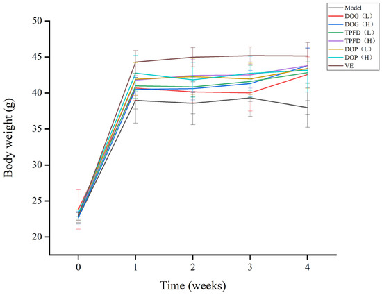 We explored the anti-ageing effects of D. officinale alcohol extract (DOAE) prepared from dried DOG, TPFD, and DOP in 70% alcohol. Mice treated with D-Gal for 7 weeks displayed significant signs of ageing, such as decreased vitality, lethargy, and hair loss, compared with the control group. However, treatment with DOG, TPFD, or DOP effectively reversed these age-related changes in mice. As shown in Figure 8, the model group treated with D-Gal experienced a significant reduction in body weight compared with that of the control group (p < 0.01). In contrast, mice in the VE group exhibited a significant increase in weight gain compared with those in the D-Gal group (p < 0.01). Moreover, the organ indices for the heart, liver, spleen, kidney, lung, and brain in the D-Gal-treated model group were significantly lower than those in the control group (p < 0.01). Notably, high-dose treatments (6.24 g/kg/d) resulted in significantly greater recovery in organ indices compared with those in low-dose (1.56 g/kg/d) D-Gal-induced ageing mice (p < 0.01). However, supplementation with DOG, TPFD, and DOP significantly alleviated the changes induced by D-Gal treatment compared with those in the model group (p < 0.05). Although no significant differences in the organ indices were noted among the DOG, TPFD, and DOP groups (Table 1), these results collectively highlight the significant anti-ageing effects of DOG, TPFD, and DOP in this ageing model.