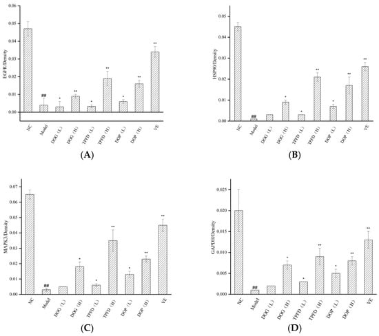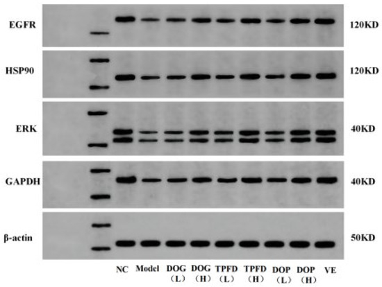 Based on four key targets (EGFR, HSP90AA1, ERK, and GAPDH) screened through network pharmacology analysis, we employed Western blotting to examine the effects of D. officinale and aqueous VE on the expression of these proteins in the kidney tissue of D-Gal-induced ageing mice models. Compared with those in the normal control group, the protein levels of EGFR, HSP90AA1, ERK, and GAPDH were significantly downregulated in the D-Gal model group (p < 0.01; Figure 9 and Figure 10). After intervention with different doses of the alcoholic extract of D. officinale, all treatment groups showed dose-dependent upregulation of these proteins. A significant improvement was observed in the low-dose group (p < 0.05), with more pronounced effects observed in the high-dose group (p < 0.01). Western blot analyses confirmed dose-dependent upregulation of EGFR, HSP90AA1, ERK, and GAPDH in kidney tissues, with high-dose groups exhibiting effects comparable to those of the vitamin E positive control (p < 0.01). Notably, the VE group exhibited the most remarkable intervention effect, exhibiting significantly better recovery of protein expression than that of the other extract groups (p < 0.01), followed by the high-dose TPFD group.