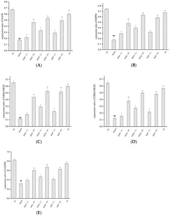 Results of Western blotting in kidney tissues. (A–E) The expression of EGFR, HSP90, ERK (44 and 42 KD), and GAPDH. The results are expressed as the means ± SD (n = 6). ## p < 0.01 compared with the control group. * p < 0.05, ** p < 0.01 compared with the model group.