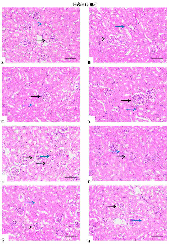 Effect of Dendrobium officinale on the ageing of kidneys in D-Galactose-induced ageing mice. Histopathological changes observed in D-Gal-induced mice. (A) Control group. (B) Model group. (C) DOG (L)-treated group. (D) DOG (H)-treated group. (E) TPFD (L)-treated group. (F) TPFD (H)-treated group. (G) DOP (L)-treated group. (H) DOP (H)-treated group. (I) VE-treated group. Black arrows indicate the glomerular morphology, highlighting the specific structural appearance and architecture for pathological assessment. Blue arrows point to the renal tubules. Histopathological changes were identified under a light microscope after haematoxylin and eosin staining (×200).