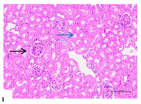 Following oral administration of D. officinale, significant improvements in the aforementioned damages were observed in the low-dose (1.56 g/kg/d) group; however, swollen tubular cells and widened glomerular capsules were still evident. In the high-dose (6.24 g/kg/d) group, swollen tubular cells were absent, and glomeruli with narrowed capsular spaces were observed. Histopathological findings in the kidney tissue in the VE and high-dose TPFD groups (Figure 11E,I) was comparable to those in the control group. These results indicate that D. officinale can effectively ameliorate D-Gal-induced renal lesions. Furthermore, D-Gal-induced histopathological lesions showed a dose-dependent response to D. officinale treatment.