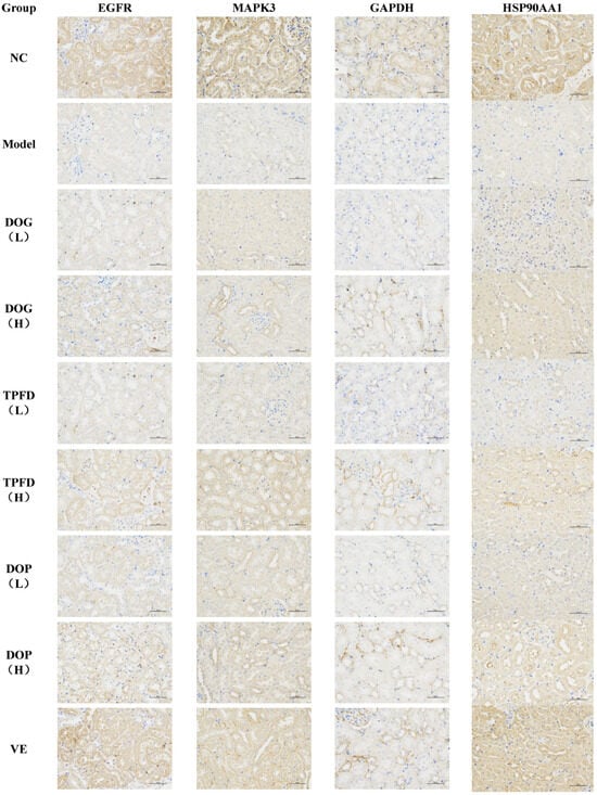Renal tissue sections were processed for immunohistochemical analysis to evaluate the localisation and expression of EGFR, HSP90, ERK, and GAPDH in D. officinale-treated, D-Gal-induced ageing mice. Following antigen retrieval (using EDTA buffer, pH 9.0) and blocking, the sections were incubated with primary antibodies (4 °C, overnight) and horseradish peroxidase-conjugated secondary antibodies, and then developed with 3,3′-diaminobenzidine. Mayer’s haematoxylin counterstaining was performed, and protein expression (brown) was quantified based on mean optical density using IPP6.0.