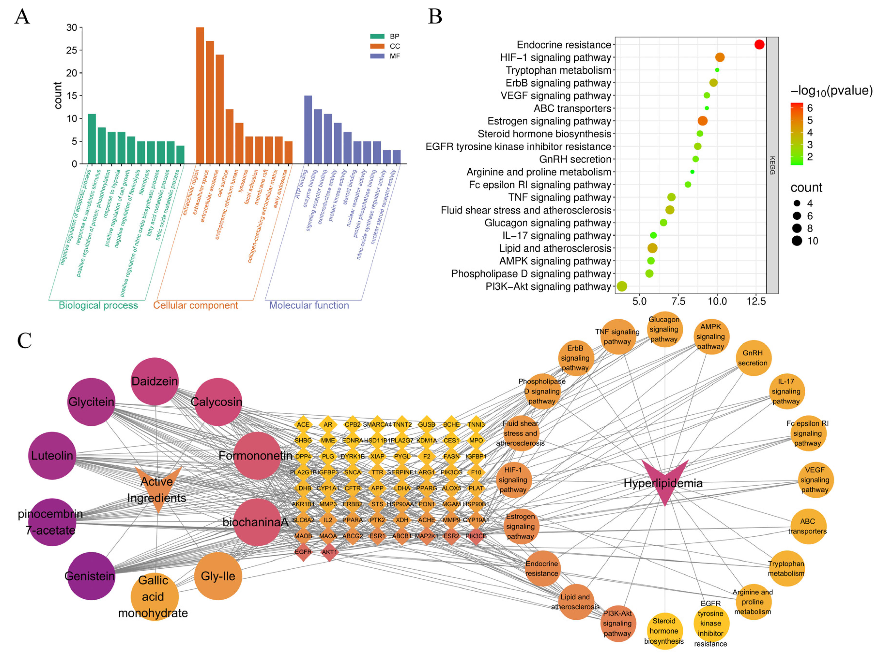 3.5.3. Functional Enrichment of GO and KEGG Pathways with Construction of the “Component-Target-Pathway-Disease” Network