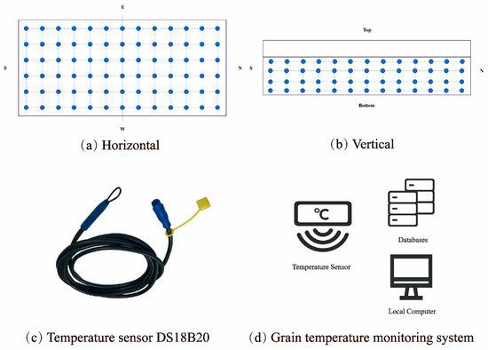 An example of a grain temperature monitoring system in a warehouse. (a) shows the horizontal arrangement of temperature sensors, while (b) demonstrates the vertical arrangement of temperature sensors. (c) presents the DS18B20 temperature sensor, which were utilized in the warehouse in this study, (d) illustrates an example of the grain temperature monitoring system.