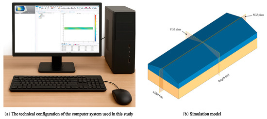 Figure 2a illustrates the technical configuration of the computer system used in this study. The system runs Windows 11 on a Dell Precision 7920 Tower workstation with an Intel® Xeon® Silver 4214R CPU. To enhance computational performance, an NVIDIA RTX A4000 GPU was employed to accelerate numerical calculations and processing-intensive tasks. Numerical simulations were performed using COMSOL Multiphysics 5.6, which implemented a simulation model based on the actual grain bin structure (Figure 2b), with key structural parameters detailed in Table 1.