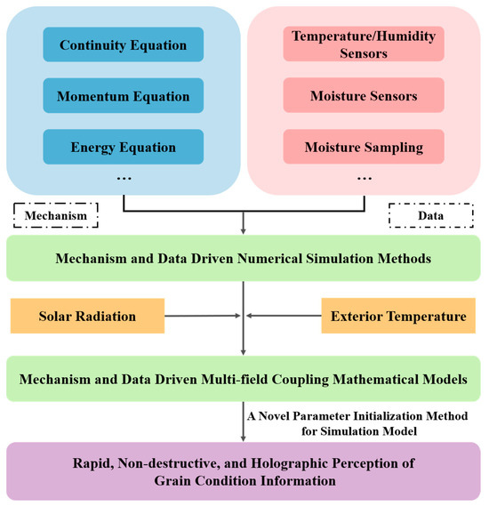 Conventional grain monitoring systems often rely on isolated data points (e.g., point-based temperature measurements), limiting holistic condition assessment. This study proposes a novel Mechanism and Data Driven (MDD) framework that integrates physical mechanisms with real-time sensor data. The framework quantitatively analyzes solar radiation and external air temperature effects on silo boundaries and introduces a novel interpolation-optimized model parameter initialization technique to enable comprehensive grain condition perception. Rigorous multidimensional validation confirms the method’s accuracy: The novel initialization technique achieved high precision, demonstrating only 1.89% error in Day-2 low-temperature zone predictions (27.02 m2 measured vs. 26.52 m2 simulated). Temperature fields were accurately reconstructed (≤0.5 °C deviation in YOZ planes), capturing spatiotemporal dynamics with ≤0.45 m2 maximum low-temperature zone deviation. Cloud map comparisons showed superior simulation fidelity (SSIM > 0.97). Further analysis revealed a 22.97% reduction in total low-temperature zone area (XOZ plane), with Zone 1 (near south exterior wall) declining 27.64%, Zone 2 (center) 25.30%, and Zone 3 20.35%. For dynamic evolution patterns, high-temperature zones exhibit low moisture (<14%), while low-temperature zones retain elevated moisture (>14%). A strong positive correlation between temperature and relative humidity fields; temperature homogenization drives humidity uniformity. The framework enables holistic monitoring, providing actionable insights for smart ventilation control, condensation risk warnings, and mold prevention. It establishes a robust foundation for intelligent grain storage management, ultimately reducing post-harvest losses.