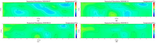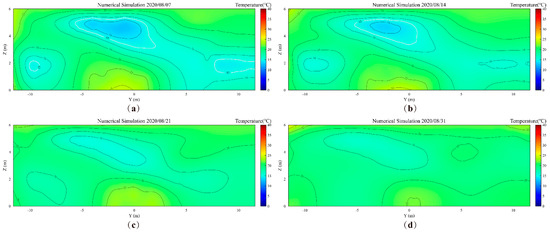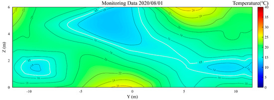 Figure 5 presents the temperature contour map of the YOZ plane during the simulation initialization on 1 August 2020. As illustrated in Figure 5, three distinct low-temperature zones were observed in the grain pile during the initial storage phase. In this study, low-temperature zones are defined as localized regions where the internal temperature of the grain pile is significantly lower than the surrounding environment or other areas (specifically, below 15 °C), though the temperature difference does not meet the criteria for stable cold cores. The total area of the initial low-temperature zones was monitored as 29.67 m2 on 1 August 2020.