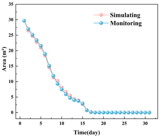 The monitored and simulated total areas of low-temperature zones in the YOZ plane of the grain pile over time.