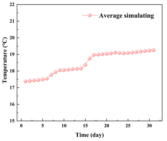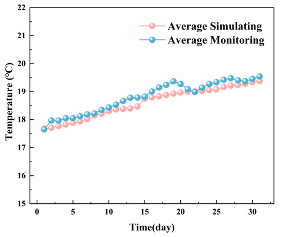 Figure 6 illustrates the monitored and simulated total areas of low-temperature zones in the YOZ plane of the grain pile over time, while Figure 7 shows the corresponding average temperature changes. The data indicate that the total area of low-temperature zones in the YOZ plane of the grain pile exhibits an increasing trend. The simulation results align closely with the actual monitored areas, with a maximum deviation of no more than 0.45 m2. Additionally, the average temperature in the YOZ plane demonstrates a monotonic increasing trend, with simulation results showing high consistency with actual monitored data (maximum deviation, <0.5 °C). This phenomenon is attributed to the intensified heat and moisture transfer processes within the grain pile due to the high temperatures in August [42].
