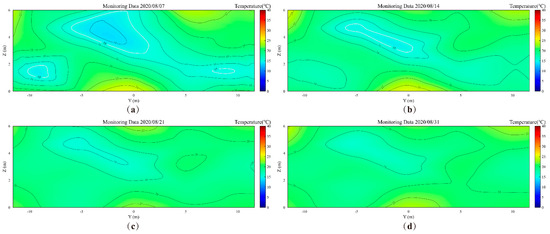 The monitored temperature contour maps of the grain pile’s YOZ plane. (a) 7th day; (b) 14th day; (c) 21st day, (d) 31st day.
