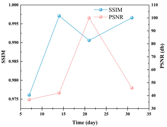 To verify the quality of the simulated contour maps, we calculated the PSNR and SSIM values for monitored and simulated contour maps at different time points (7 days, 14 days, 21 days, and 31 days). As shown in Figure 10, the SSIM values consistently remain at 0.97 or higher, indicating that the simulated contour maps share high structural and visual similarity with the monitored contour maps. At 21 days, the PSNR value reaches infinity in theory, signifying that the simulated image is completely consistent with the monitored contour map at this time point. Meanwhile, at 31 days, the PSNR value achieves its highest level of 45.911 dB, and the SSIM value reaches 0.9966, further validating the superior performance of the simulated contour maps.